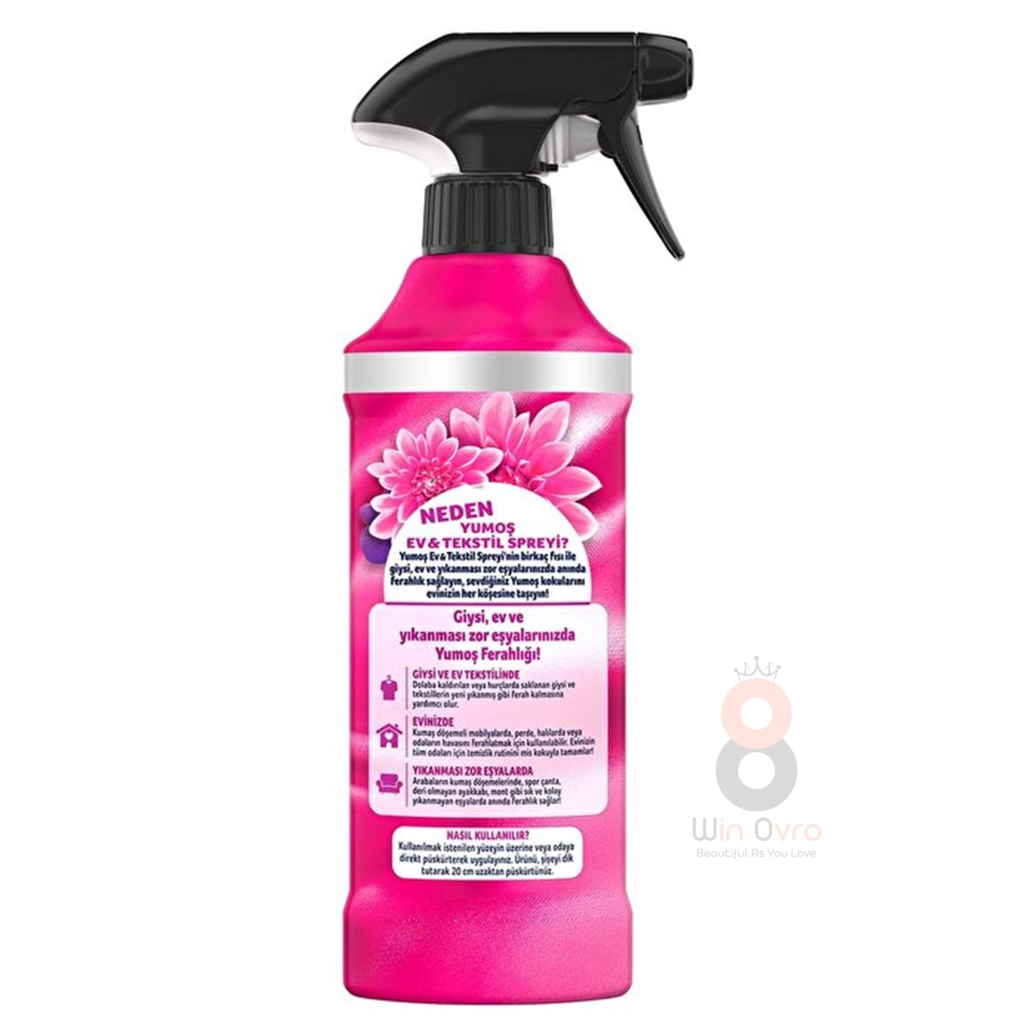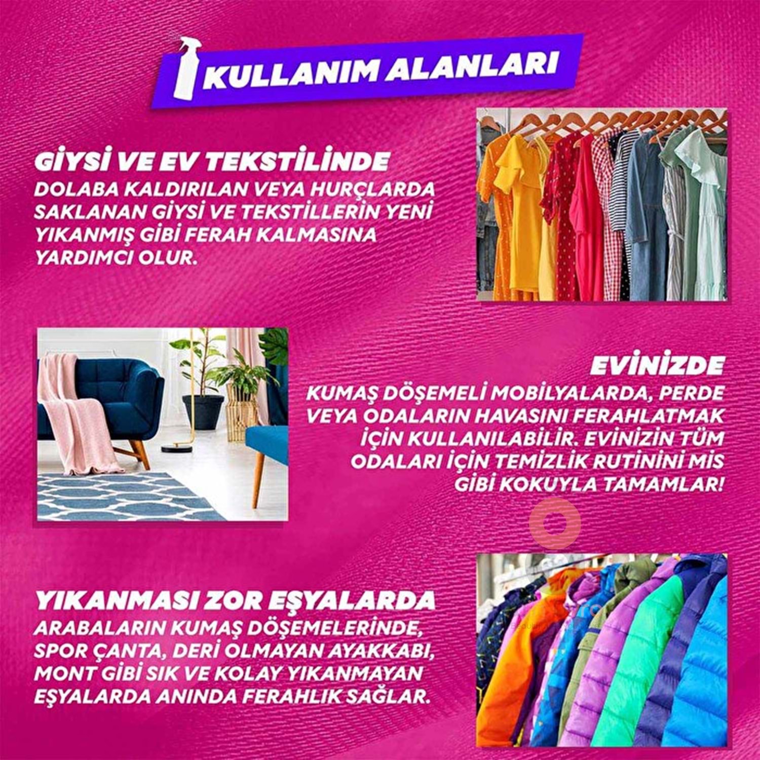 Hadi gel, Yumoş Ev&Tekstil Spreyi'nin farklı kullanım alanlarına göz atalım. Yumoş Ev&Tekstil Spreyi'ni koltuk, perde, halı gibi sürekli temizleyemeyeceğin, yıkanması zor ev eşyaların için kullanabilirsin. Yumoş Ev&Tekstil Spreyi'ni fısla, Orkide ferahlığını evinin her köşesinde doyasıya hisset!