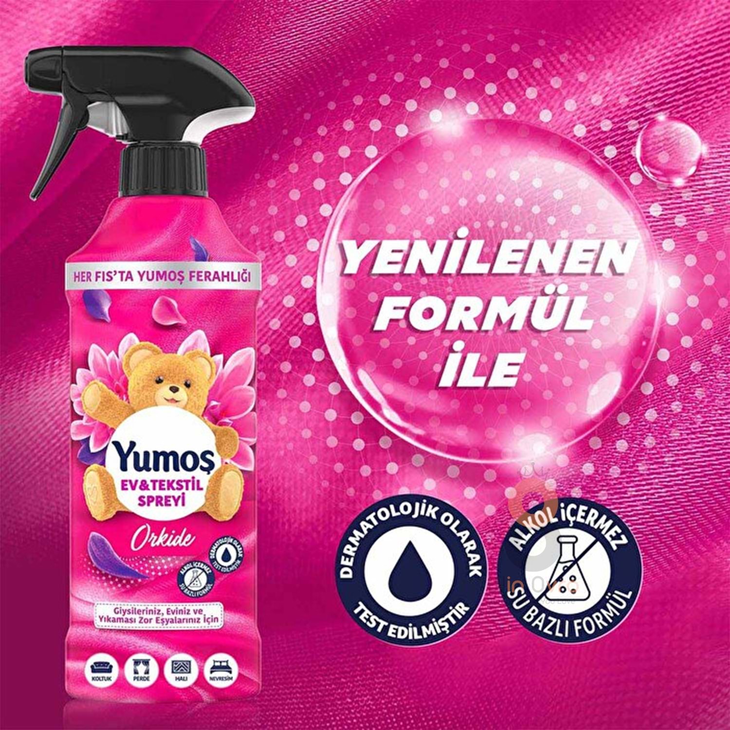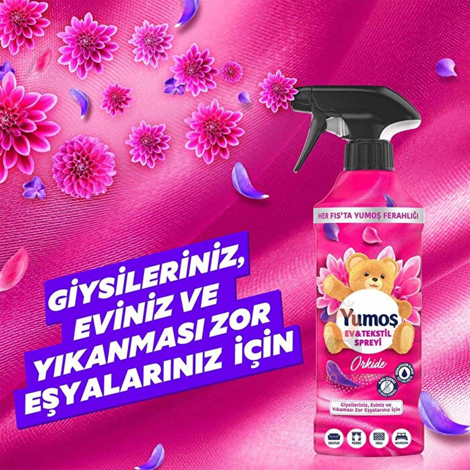 Sana harika bir haberimiz var. Hazır mısın? Yumoş ailesinin yıllardır en beğenilen üyelerinden biri olan Yumoş Ev&Tekstil Spreyi, yenilenen ambalajı, formülü ve Yumoş’un en sevilen parfümleriyle seninle! Şimdi Yumoş’un en sevilen yumuşatıcı kokuları yıkanması zor eşyalarında ve evinin farklı köşelerinde yanında. Hem de sadece tek fıs’ta! Yeni Yumoş Ev&Tekstil Spreyi Orkide ile her fıs’ta ferahlatıcı Orkide kokusunu evinin dilediğin köşesine taşıyabilir, yoğun tempolu günlerinde bile evindeki temizlik hissini koruyabilirsin.