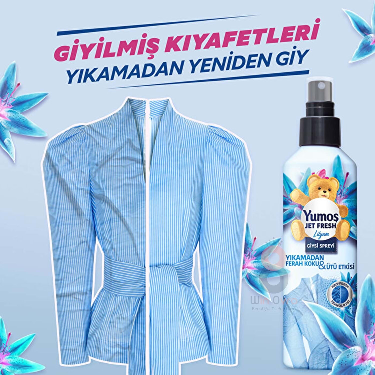 Türkiye’de bir ilk olan Yumoş Jet Fresh Giysi Spreyi Lilyum 200 ml tam da bu sorunu çözmek için giysi bakım uzmanları* tarafından buna özel olarak geliştirildi. Yumoş Jet Fresh Giysi Spreyi Lilyum 200 ml ile giysilerini yıkamadan, hızlıca Yumoş ile yıkanmış gibi ferahlatabilir, kırışıklıklarını giderebilirsin. Böylece hem giysilerinin fazla yıkama sonucu yıpranmasını önleyebilir hem de su, enerji ve zaman tasarrufu sağlayabilirsin. Yumoş Jet Fresh Giysi Spreyi Lilyum 200 ml, tekrar yıkanacak kadar kirli hissettirmeyen giysilerini Yumoş’la yıkanmış gibi ferahlatır. Yumoş Extra yumuşatıcı ailesinin en sevilenlerinden Lilyum kokusu ile giysilerin makineden yeni çıkmışçasına ferah kokar. Ayrıca Pro-Fresh teknolojisi içeren Yumoş Jet Fresh, giysilerini ferahlatmanın yanı sıra ütü etkisi göstererek giysilerindeki kırışıklıkları azaltır, böylece giysilerini ütülemeden yeniden giyebilmeni sağlar. Üstelik bu kadar çok etkiyi sadece 15 dakikada gösterir. Hayatını kolaylaştıracak Pro-Fresh teknolojisi ile geliştirilmiş Yumoş Jet Fresh Giysi Spreyi, Yumoş’un en iyi yumuşatıcı kokularından Lilyum ferahlığıyla seni bekliyor. Dermatolojik olarak test edilmiş olan Yumoş JetFresh Giysi Spreyi Lilyum’u güvenle kullanabilir, en sevdiğin giysilerine iyi bakıp giysilerinin seninle kalmasını sağlayabilirsin.