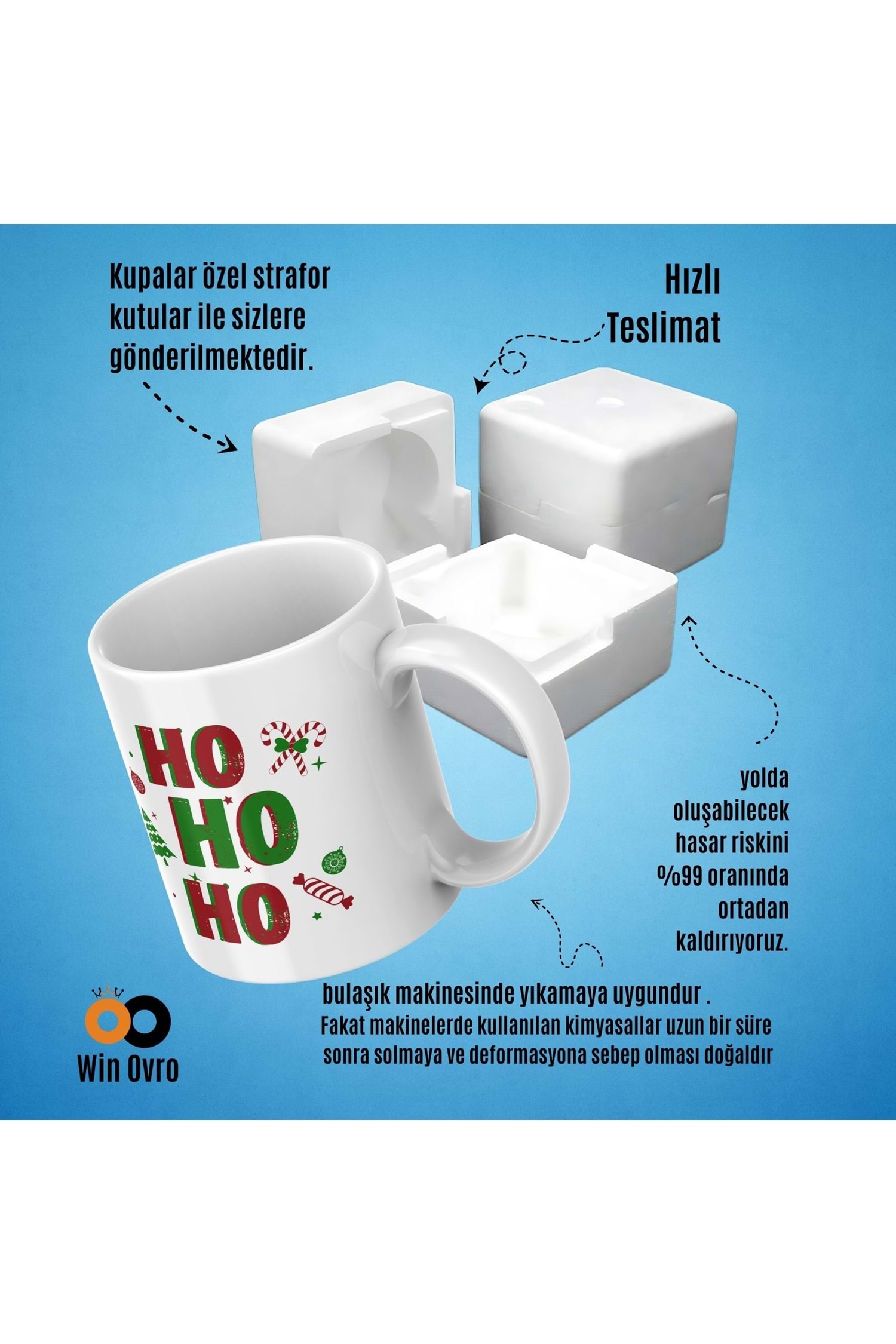 Win Ovro Premium Beyaz Porselen Hediye Çift Yön Baskılı Kupa Bardak - Ho Ho Ho Christmas
