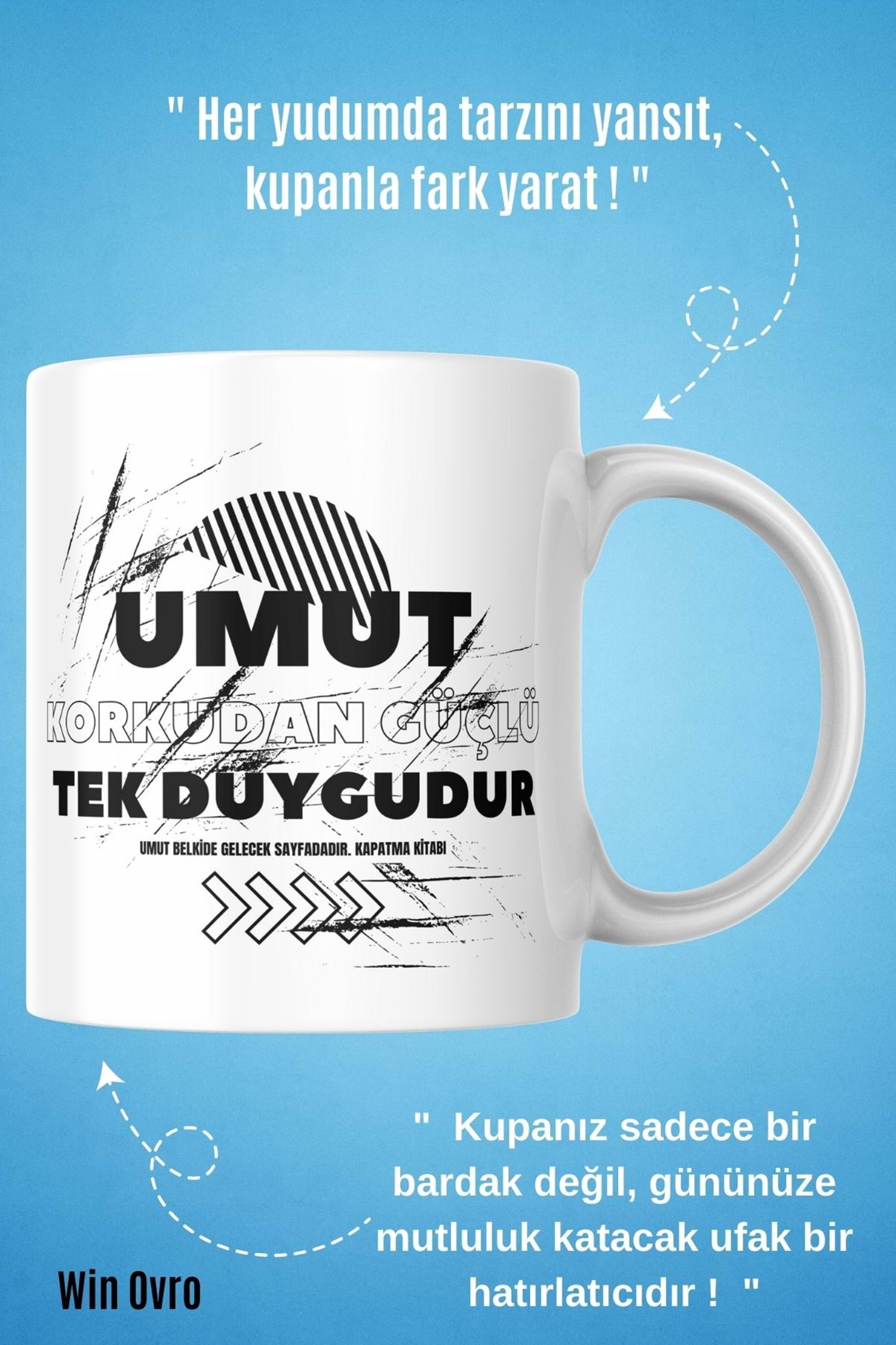 Win Ovro Premium Beyaz Porselen Hediye Çift Yön Baskılı Kupa Bardak - Umut Korkudan Güçlü Tek Duygu