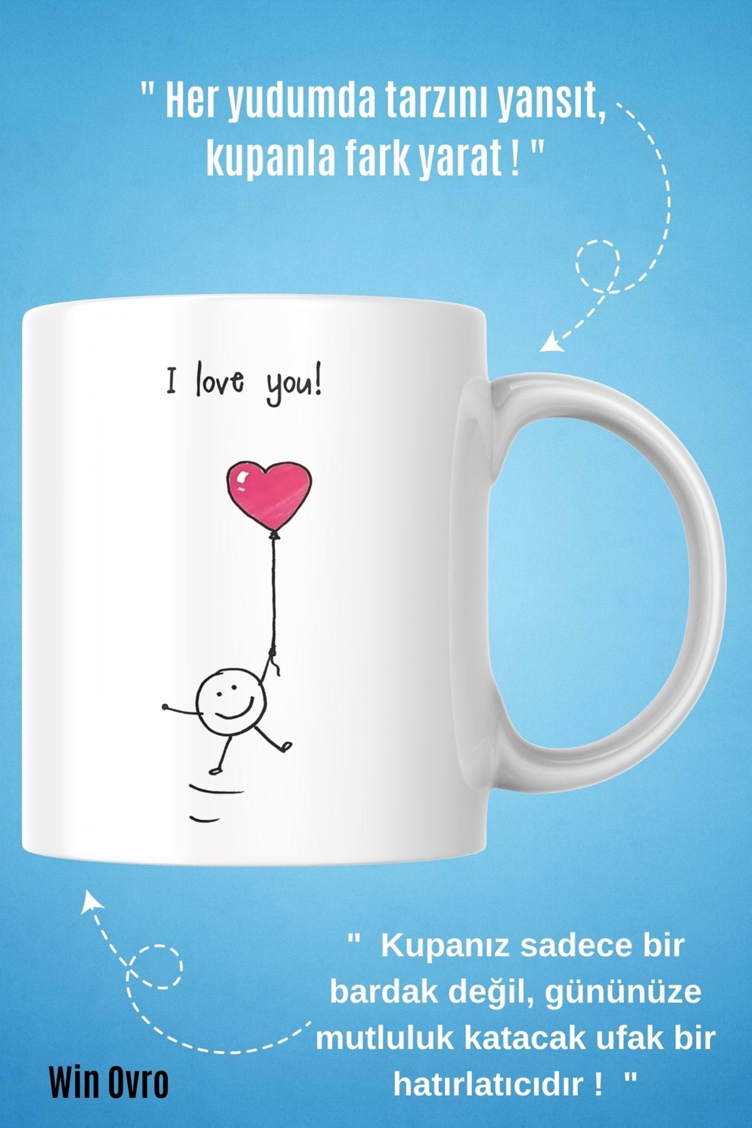 Win Ovro Premium Beyaz Porselen Hediye Kupa Bardak Çift Yön Baskı - I Love You Balon Kalp