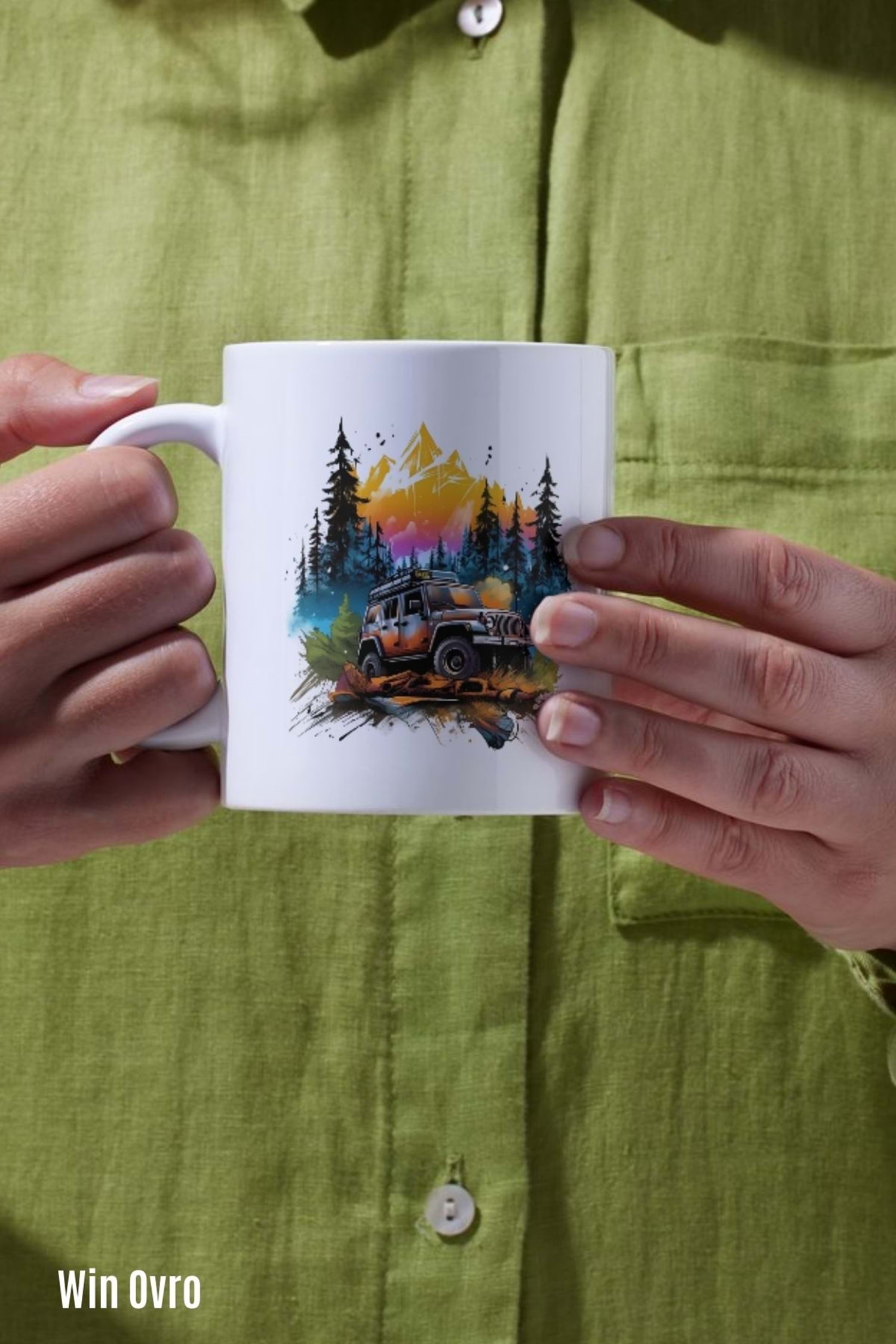 Win Ovro Premium Beyaz Porselen Hediye Kupa Bardak Çift Yön Baskı - Nature Car Off Road Jeep