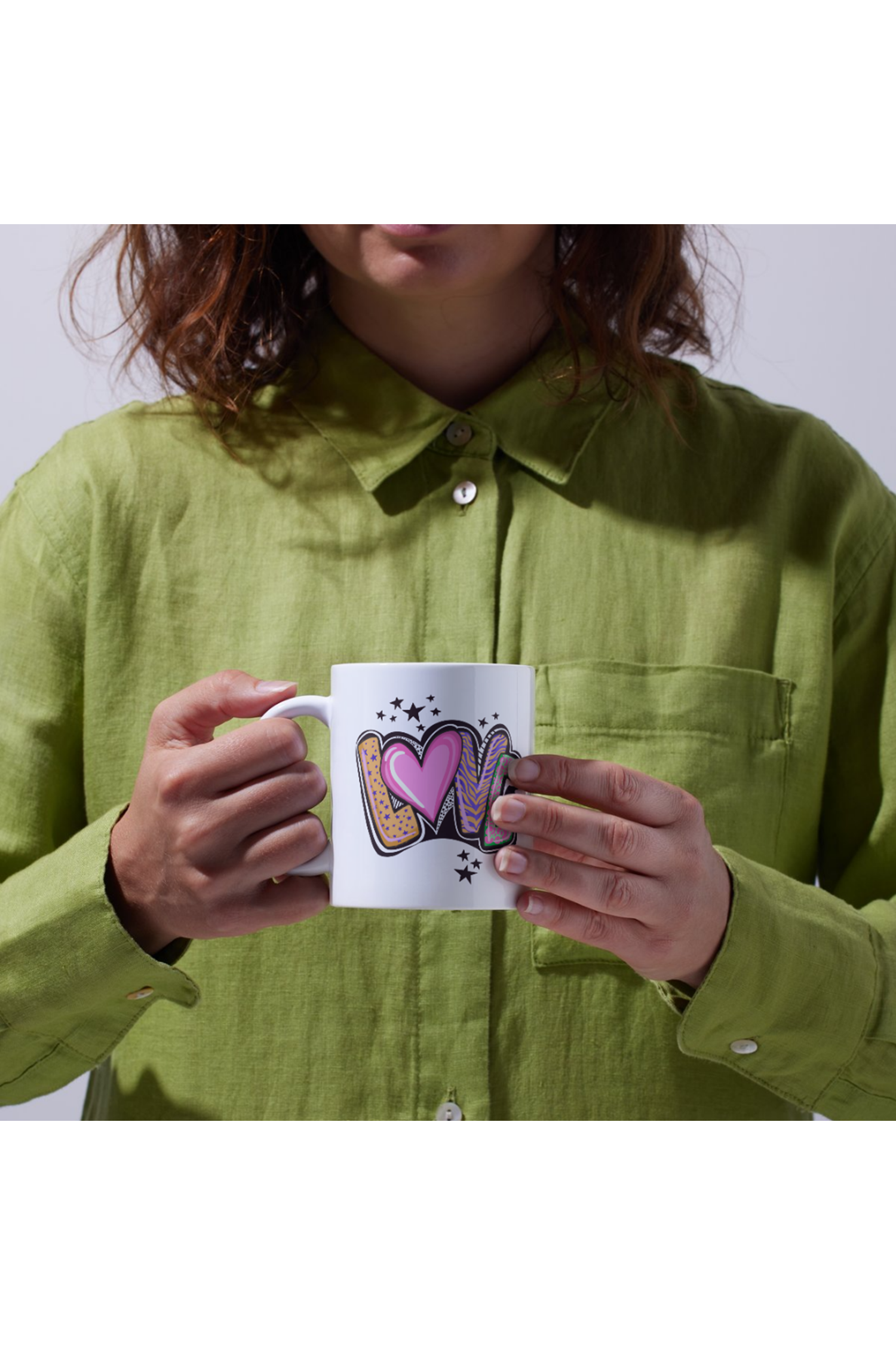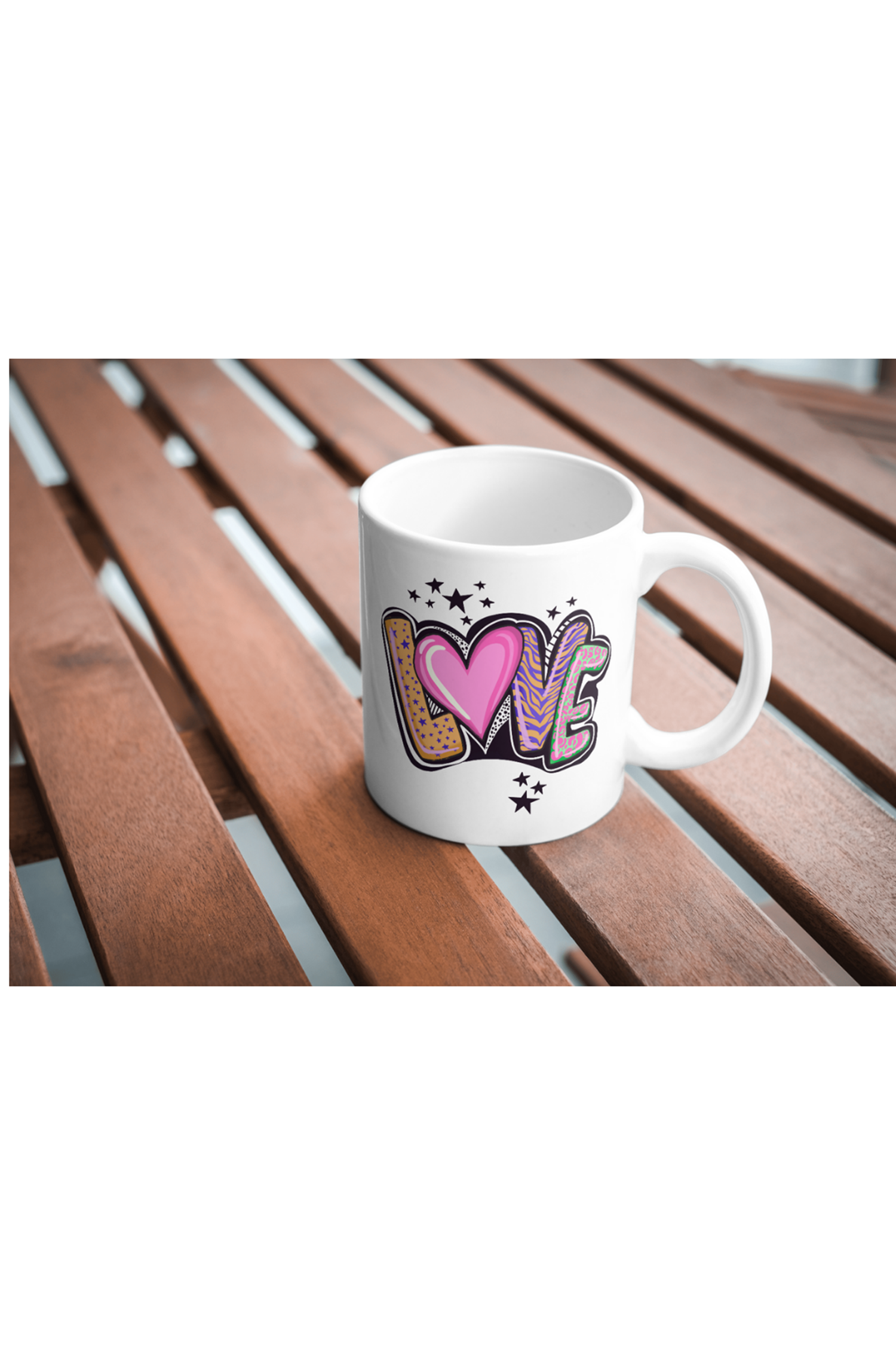 Win Ovro Premium Ultra Beyaz Porselen Kupa Bardak Çift Yönlü Baskılı - Love Yazı Desenli Renkli