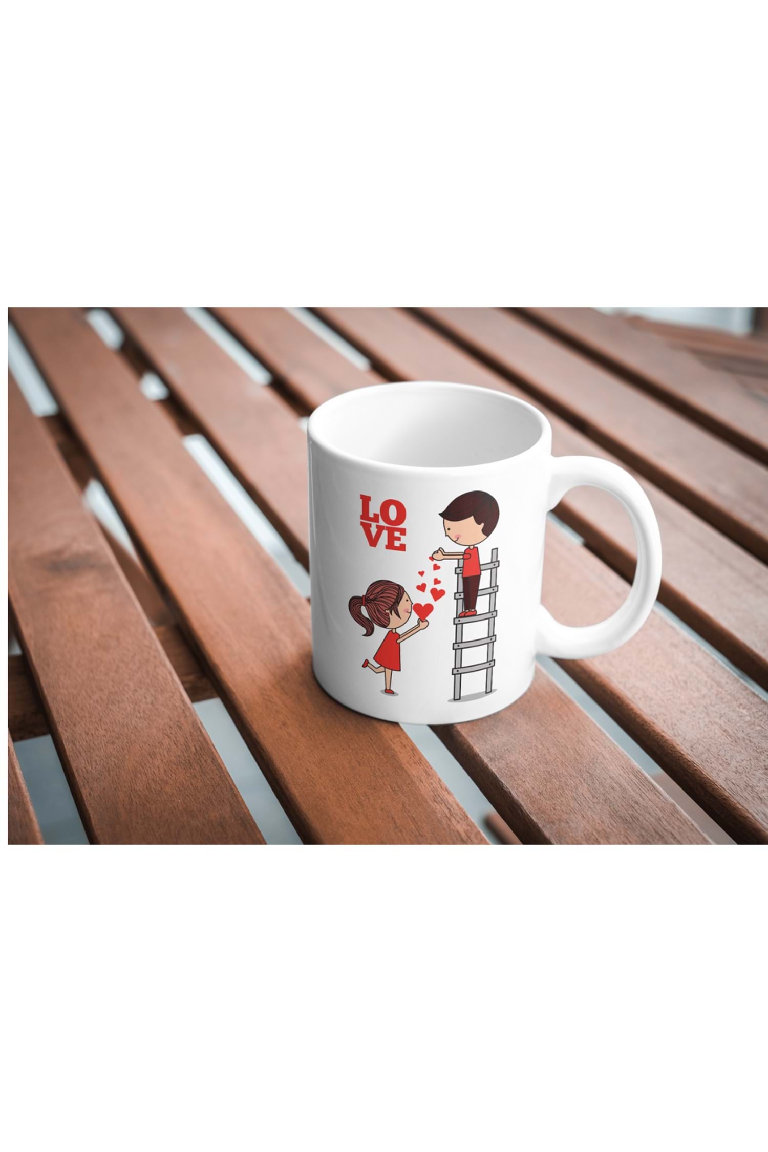 Win Ovro Premium Ultra Beyaz Porselen Kupa Bardak Çift Yönlü Baskılı - Sevgili Aşk Kalp Merdiven