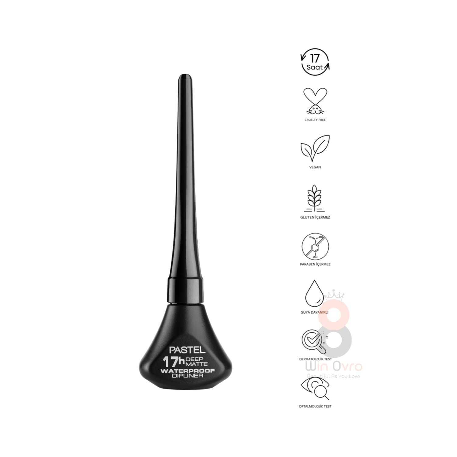 Pastel Deep Matte Waterproof Dipliner, 17 saate kadar kalıcı ve " WATERPROOF" suya dayanıklı formülüyle kusursuz bir makyaj deneyimi sunar. Yoğun siyah ve mat bitişiyle gözlerinizi şekillendirip belirginleştirerek bakışlarınızı ön plana çıkarır. Dağılmadan kolay sürülebilen özel fırçası ve likit yapısı sayesinde kusursuz çizgiler çekmenizi sağlar. Cruelty free, dermatolojik ve oftalmolojik olarak test edilmiştir. Paraben ve gluten içermez.